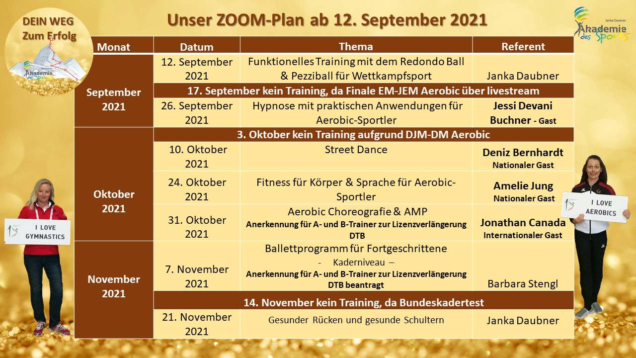 Jeden Sonntag findet von 18 - 19.30 Uhr ein Zoom Training Aerobic statt: